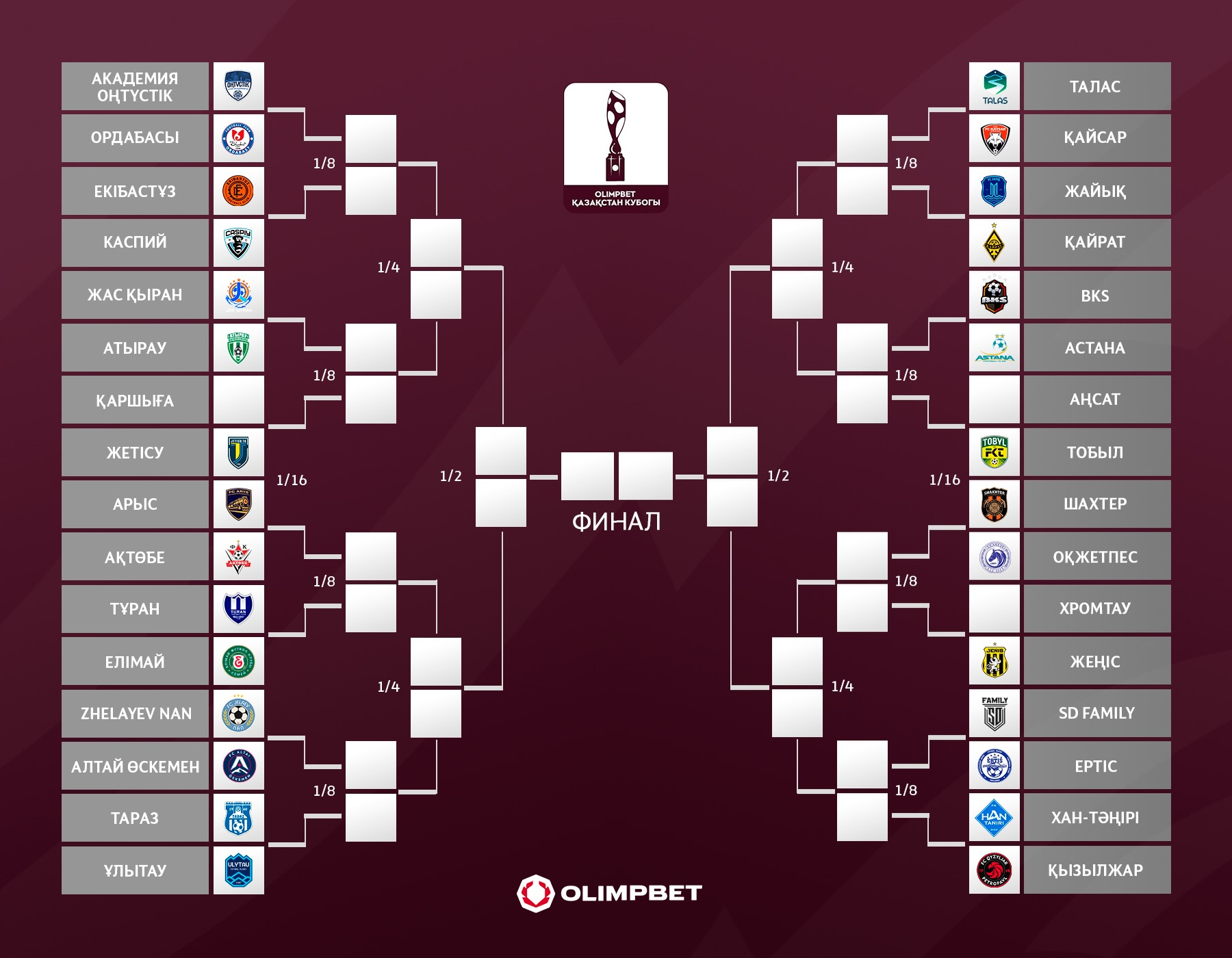 К участию в розыгрыше допущены 16 клубов Премьер-лиги: "Кайрат" (Алматы), "Астана", "Тобол" (Костанай), "Елимай" (Семей), "Актобе", "Женис" (Астана), "Ордабасы" (Шымкент), "Окжетпес" (Кокшетау), "Кызылжар" (Петропавловск), "Улытау" (Жезказган), "Кайсар" (Кызылорда), "Жетысу" (Талдыкорган), "Атырау", "Каспий" (Актау), "Иртыш" (Павлодар) и "Алтай" (Усть-Каменогорск), 8 клубов Первой лиги: "Туран" (Туркестан), Шахтёр" (Караганда), "Академия Оӊтүстік" (Шымкент), "Тараз", "Экибастуз" (Павлодарская обл.), "Хан-Тенгри" (Алматы), "Арыс" (Туркестанская обл.) и "Жайык" (Уральск), 5 клубов Второй лиги: "SD Family" (Астана), "Жас Кыран" (Алматы), "Талас" (г. Каратау Жамбылской обл.), "Каршыга" (Алматы) и "Хромтау", а также 3 любительские команды: "BKS" (Алматы), "Ансат" (Павлодар) и "Желаев Нан" (Уральск).
